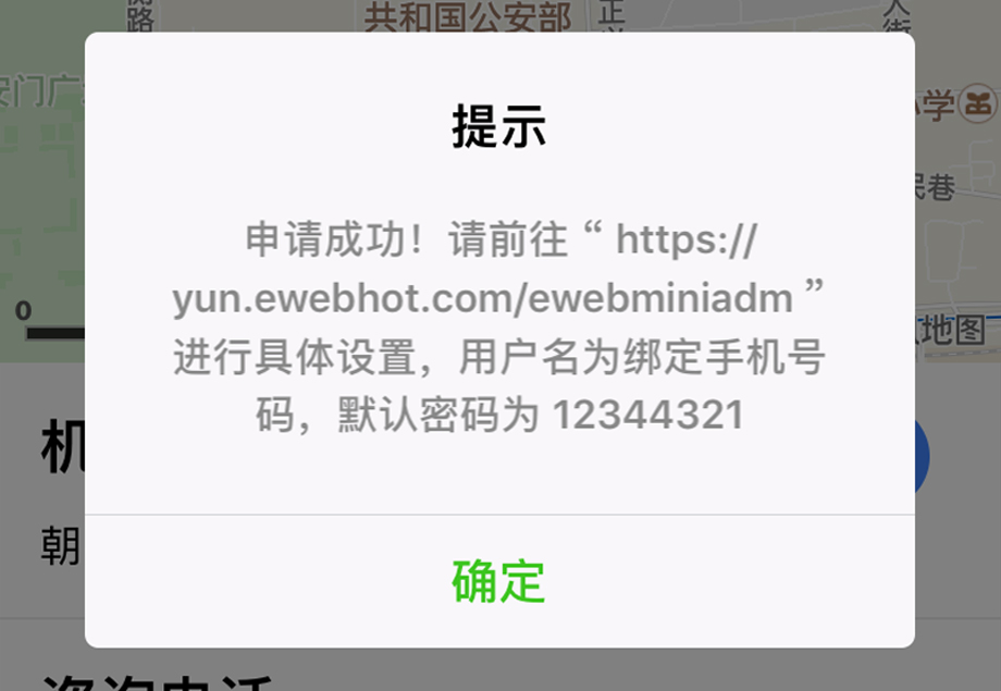 九、出現(xiàn)提示彈窗,點擊鏈接https://yun.ewebhot.com/ewebminiadm進入后臺進行設置