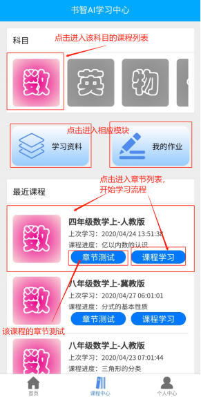 第二大功能模塊,也是重點(diǎn)模塊,課程中心,在課程中心,有我們的豐富的學(xué)習(xí)資料和作業(yè),孩子可以針對(duì)科目,根據(jù)知識(shí)點(diǎn)和章節(jié)進(jìn)行測試。