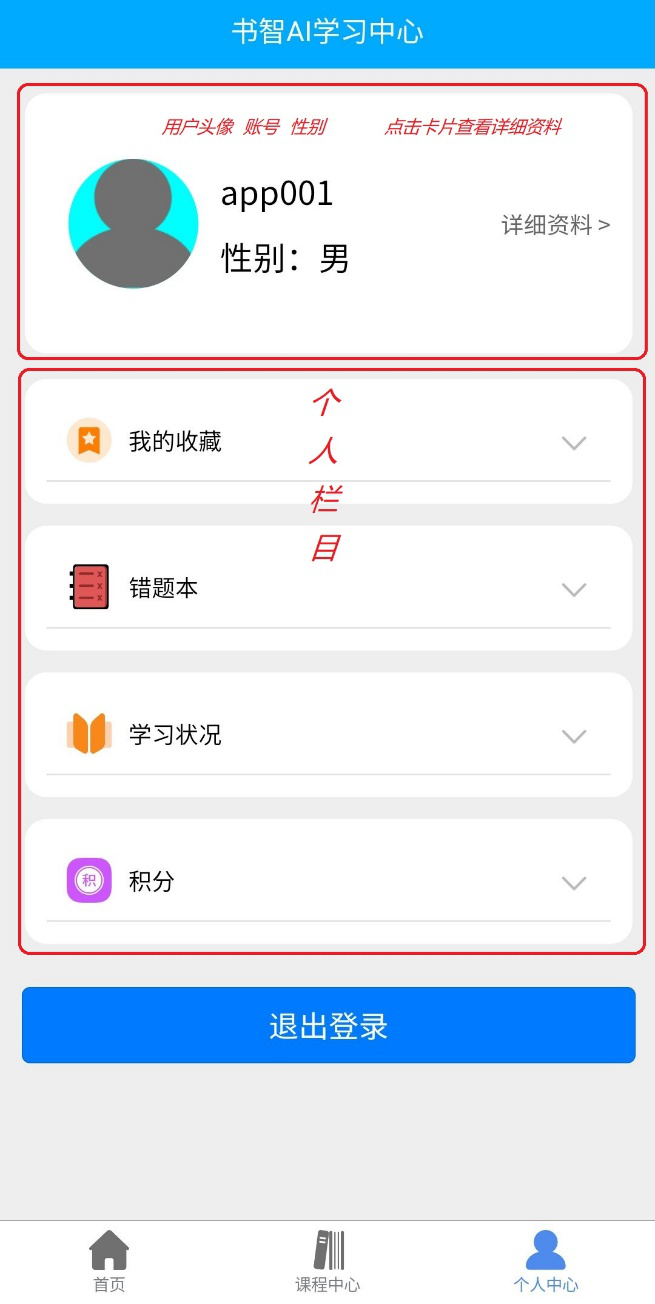 第三大功能模塊是:個(gè)人中心,在個(gè)人中心,有我的收藏,錯(cuò)題本,學(xué)習(xí)狀況和積分。