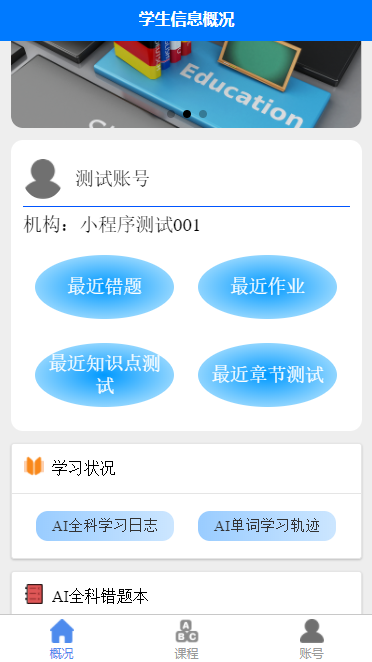 最近錯(cuò)題,最近作業(yè),最近知識(shí)點(diǎn)測(cè)試,最近章節(jié)測(cè)試,學(xué)習(xí)狀況,AI全科錯(cuò)題本等。